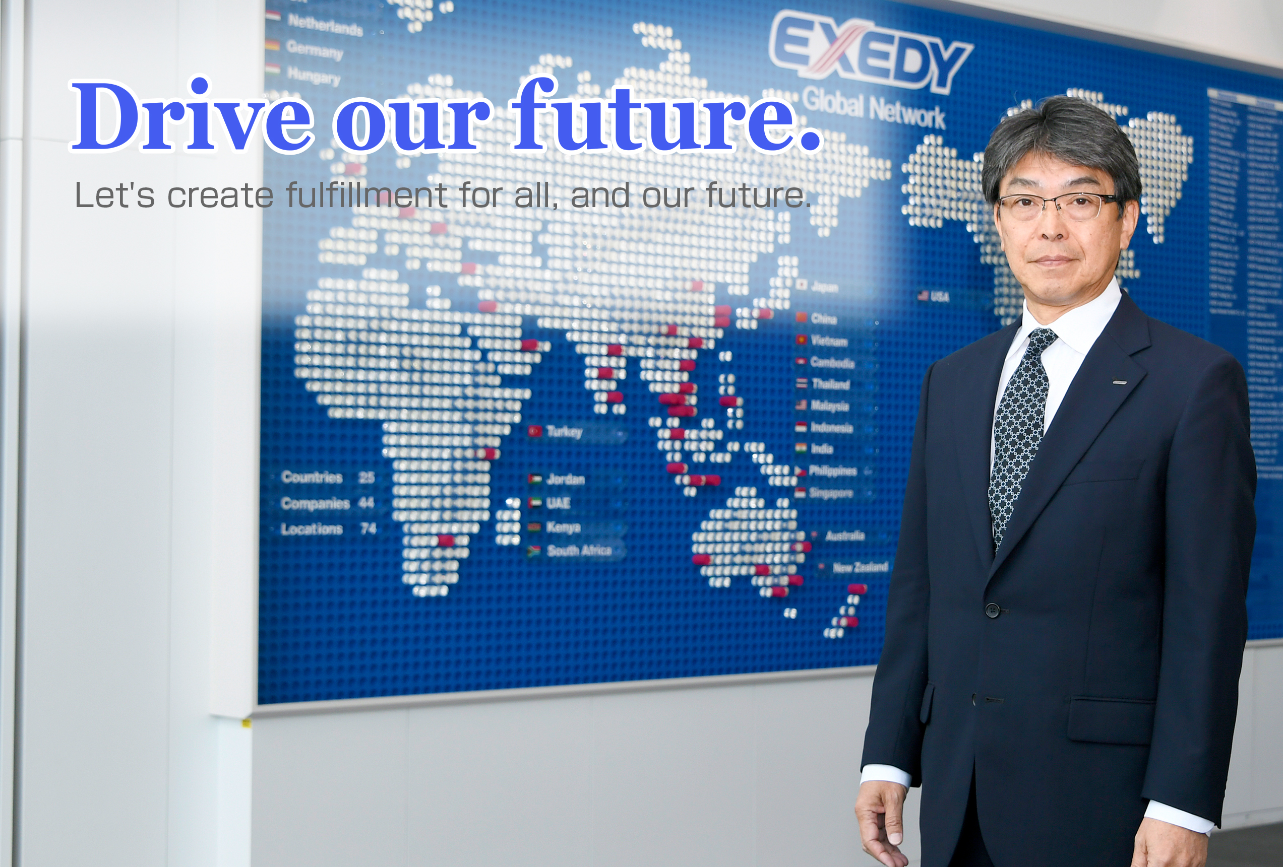 In order to further evolve these activities, we have recently renamed our CSR activities to "Sustainability Activities" and formulated a 2050 long-term vision, long-term goals, and accompanying slogan. In particular, with regard to the international challenge of "prevention of global warming", we will promote energy-saving activities, introduce renewable energy, and develop Next-Generation Electric Products and Future Products, with the goal of achieving carbon neutrality (virtually zero emissions of greenhouse gases) by 2050. The slogan "Drive our future." expresses our will to move the future by ourselves. All members of the EXEDY Group share this mind, and we will continue to create "fulfillment for all" through our sustainability activities.